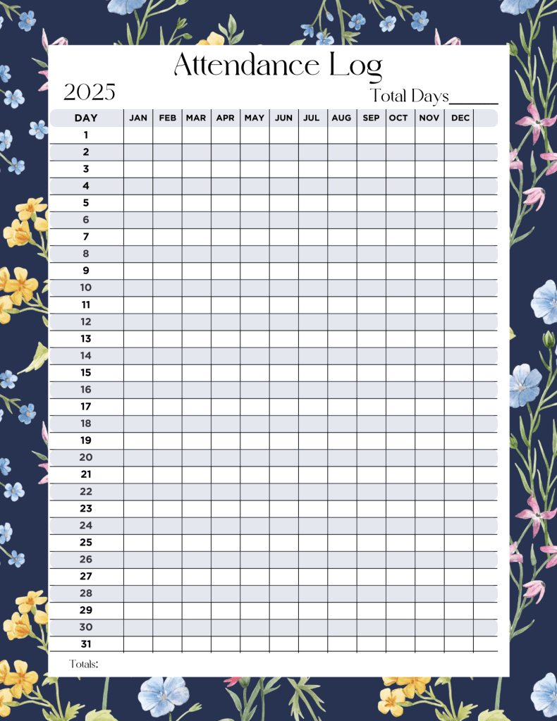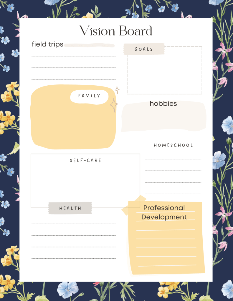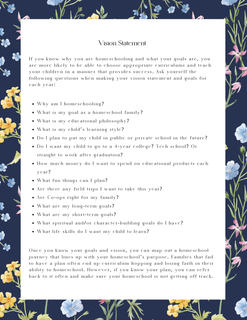 Our homeschool planner includes 2-page monthly calendars and weekly calendars for May 1, 2025, to July 31, 2026, vision statement and end of year reflection questions, vision board for each month, homeschool reminders, and attendance chart.